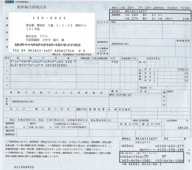 ※弊社で加入しているAIU海上保険様の動産保険(電動昇降機)の加入証書です。 お客様にご安心頂きたく加入状況が分かるように掲示させていただきます。